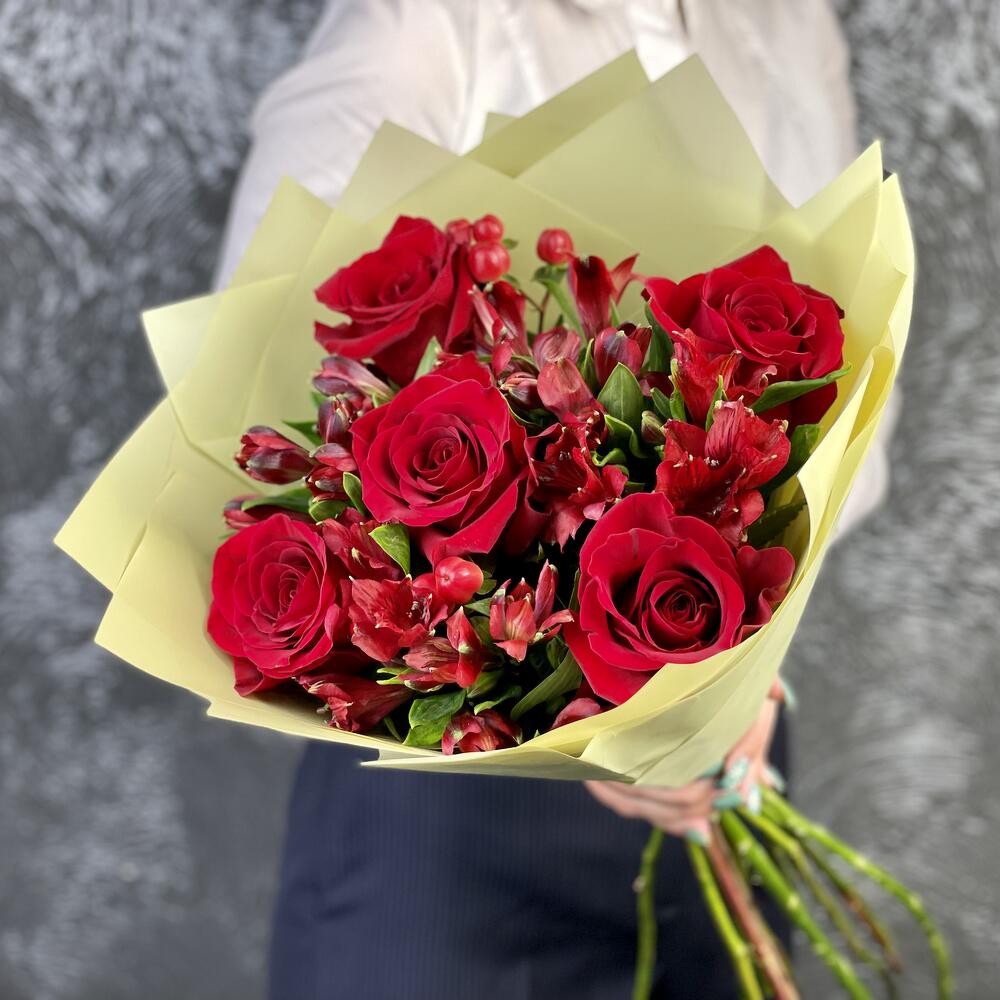 Роскошная композиция из 5 эквадорских красных роз и 6 красных альстромерий с зеленью фисташки и гиперикумом. Идеальный выбор для особых случаев. Заказать цветы с доставкой на дом в Чаплыгине.