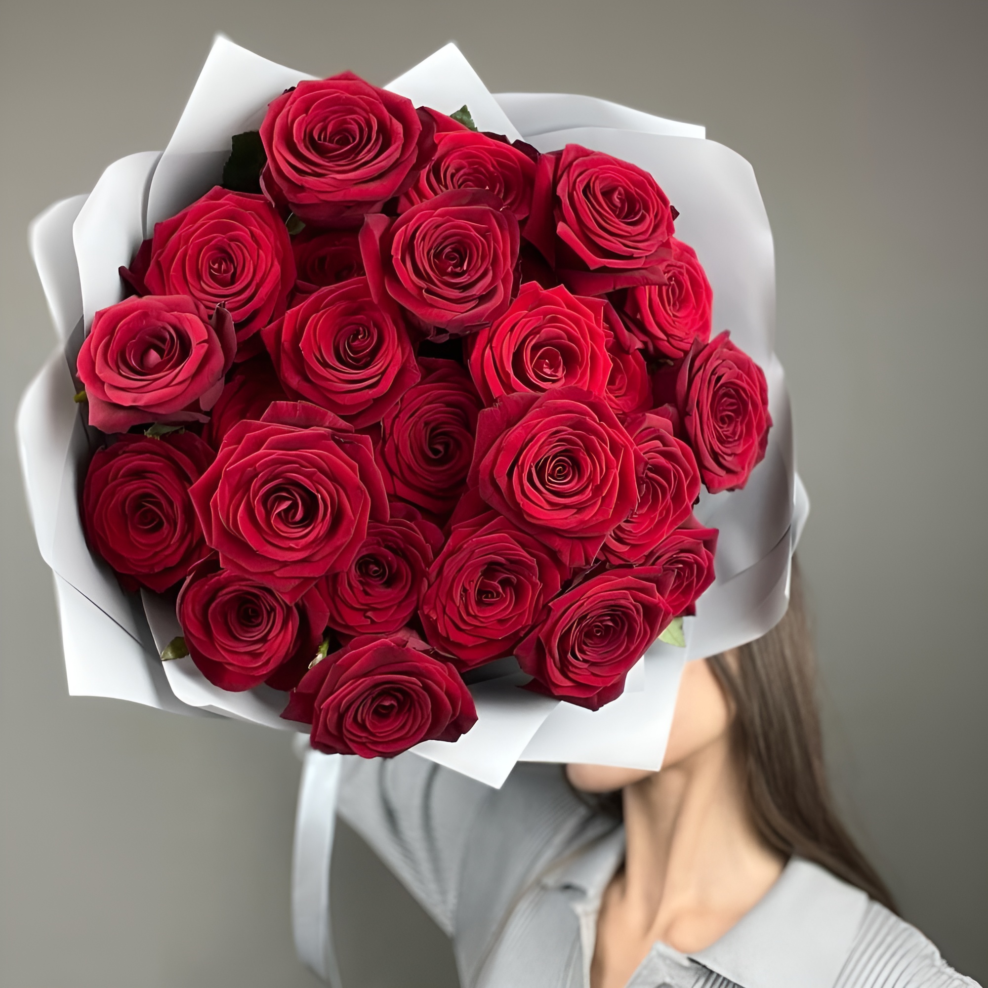 Изысканный букет из 25 роз красного оттенка с длиной стебля 60 см — воплощение королевской роскоши. Упакован в матовую плёнку с атласной лентой. Идеальный подарок для особых моментов. Купить букет роз Чаплыгин.