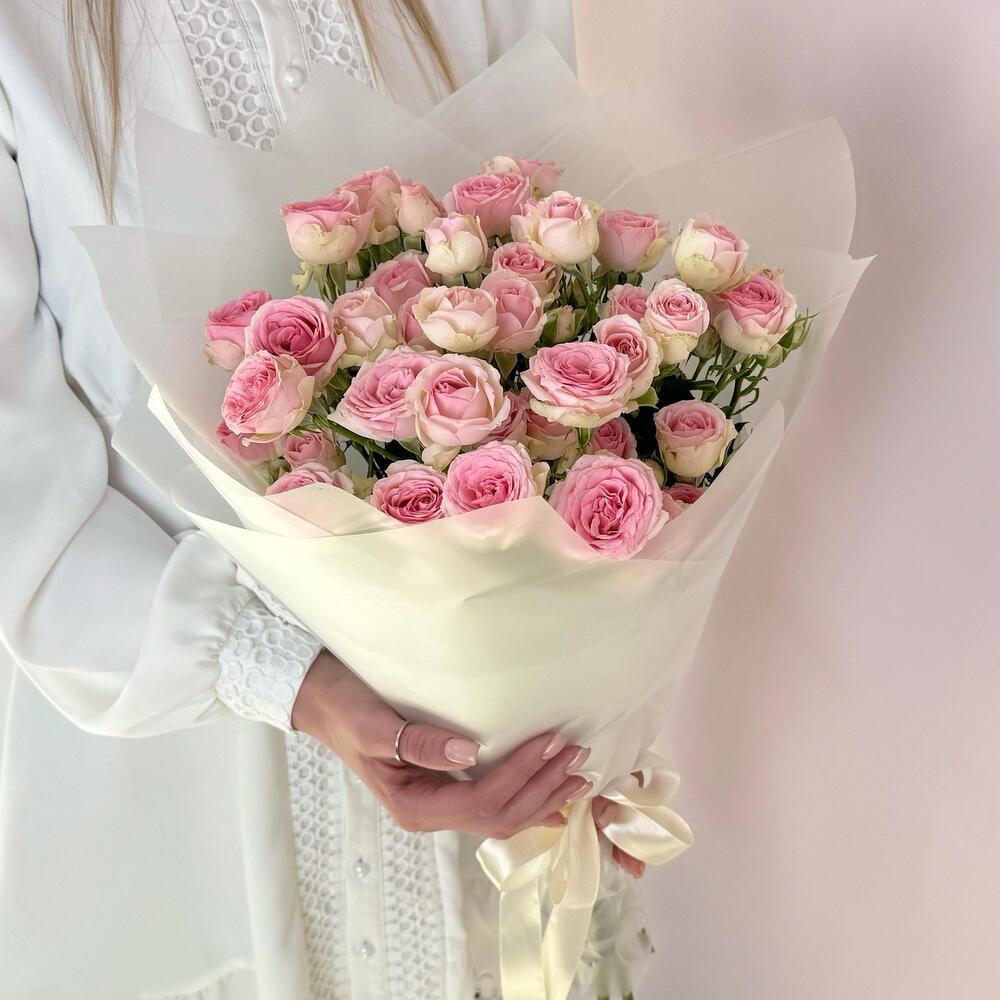 Букет «Нежный аромат» – пышные розовые кустовые розы в элегантной упаковке