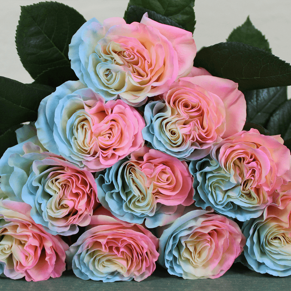 Красочная композиция из свежих разноцветных роз создает настроение праздника.
