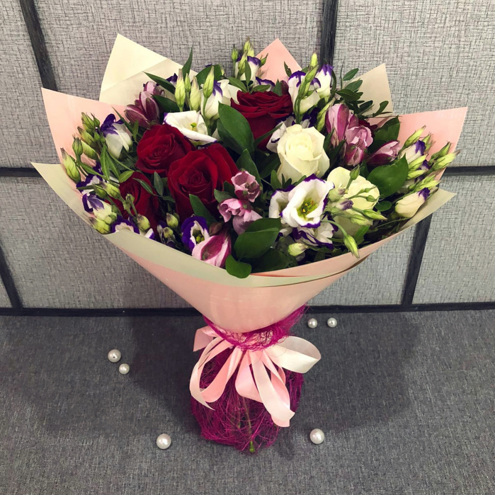 Букет из роз, эустом и альстромерий – гармония утонченности и свежести