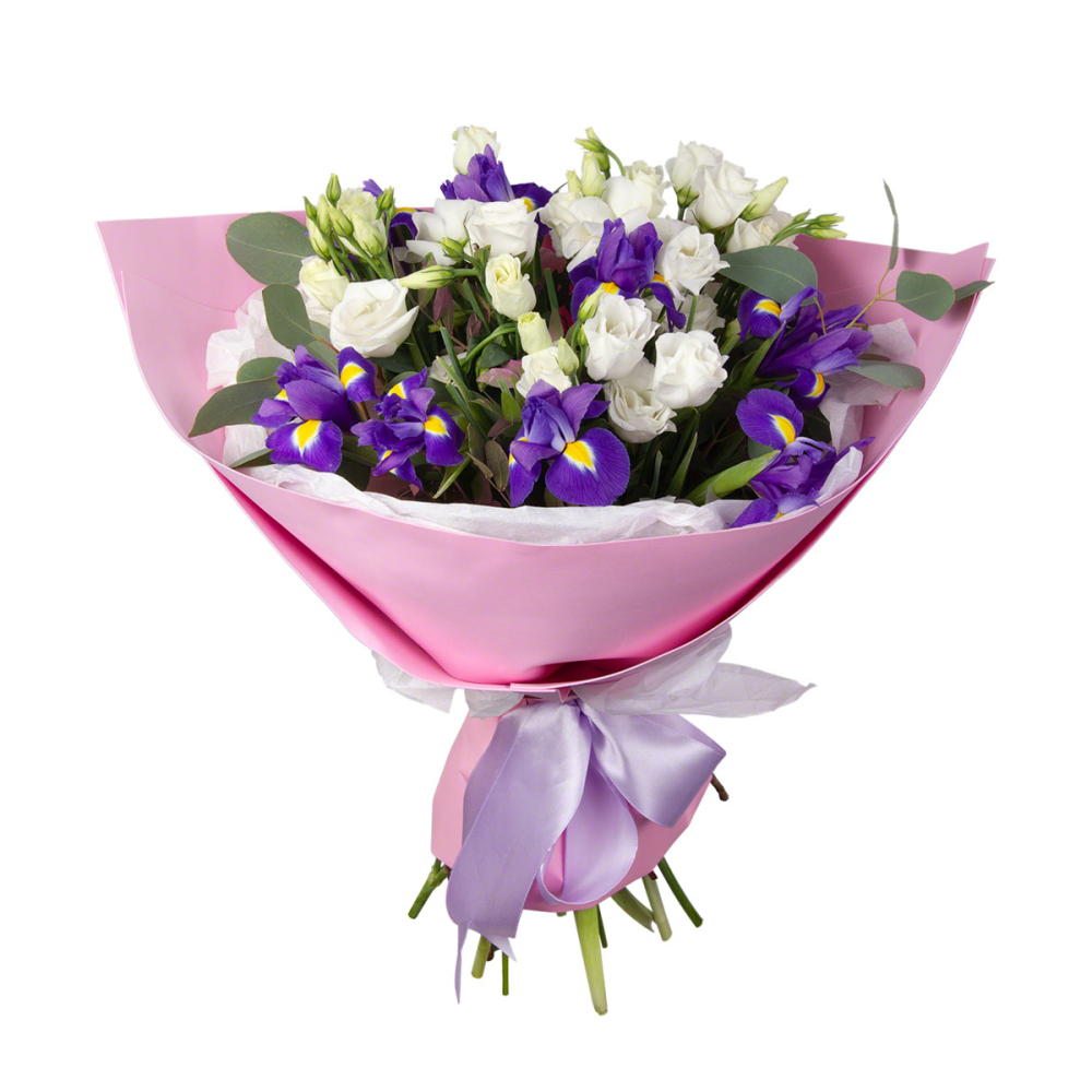Утончённый букет «Подарок» сочетает синие ирисы, нежные эустомы и ароматный эвкалипт. Идеальный выбор для романтического подарка, дня рождения или особого момента. Свежие цветы с доставкой.