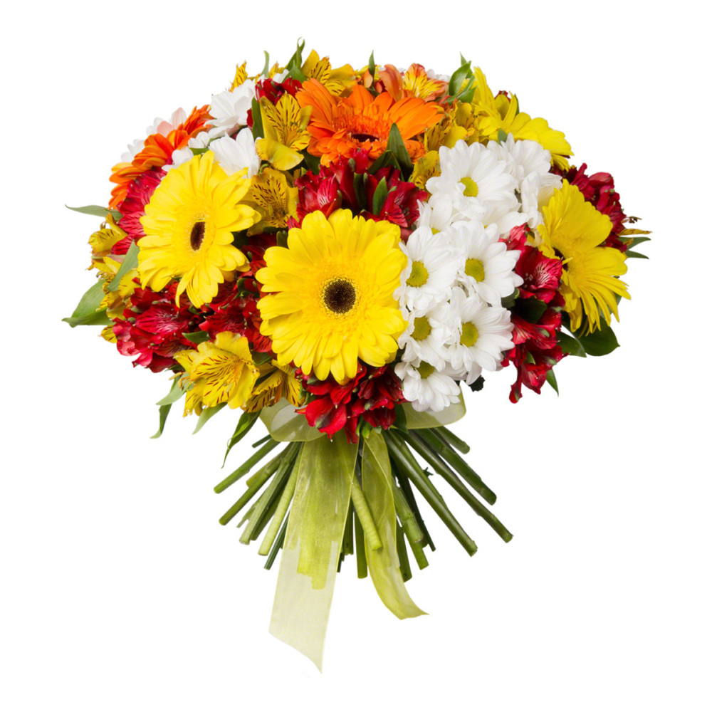 Жизнерадостный букет «Красочный фонтан» сочетает нежные альстромерии, солнечные герберы и пышные хризантемы.