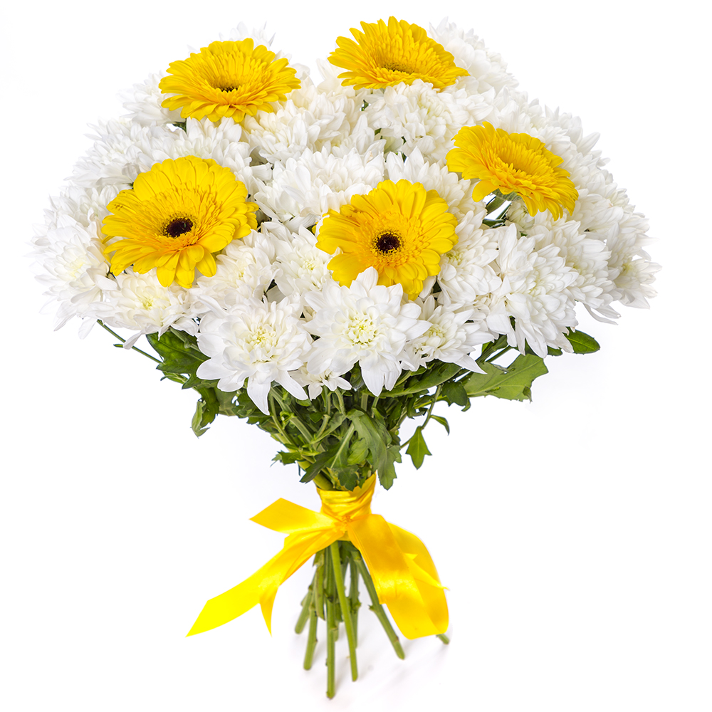 Яркий букет сочетает солнечные герберы и нежные белые хризантемы. Идеальный подарок для создания праздничного настроения. Свежие цветы с доставкой.