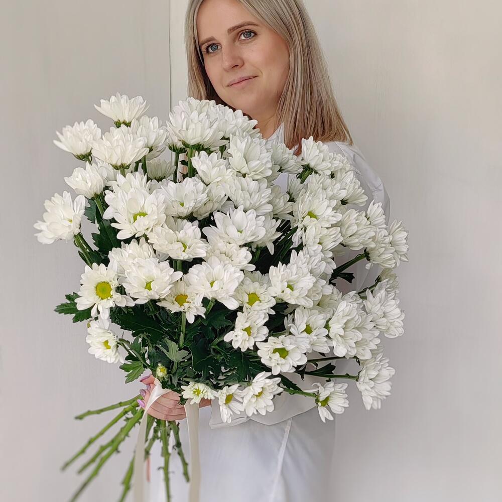 Очаровательный букет «Ромашка» из белоснежных хризантем напоминает летнее поле.